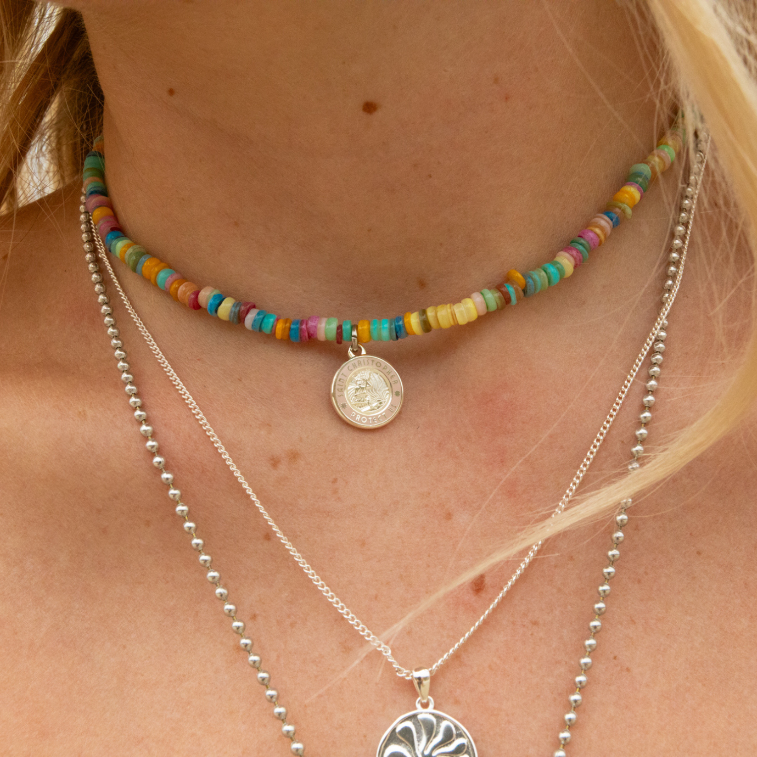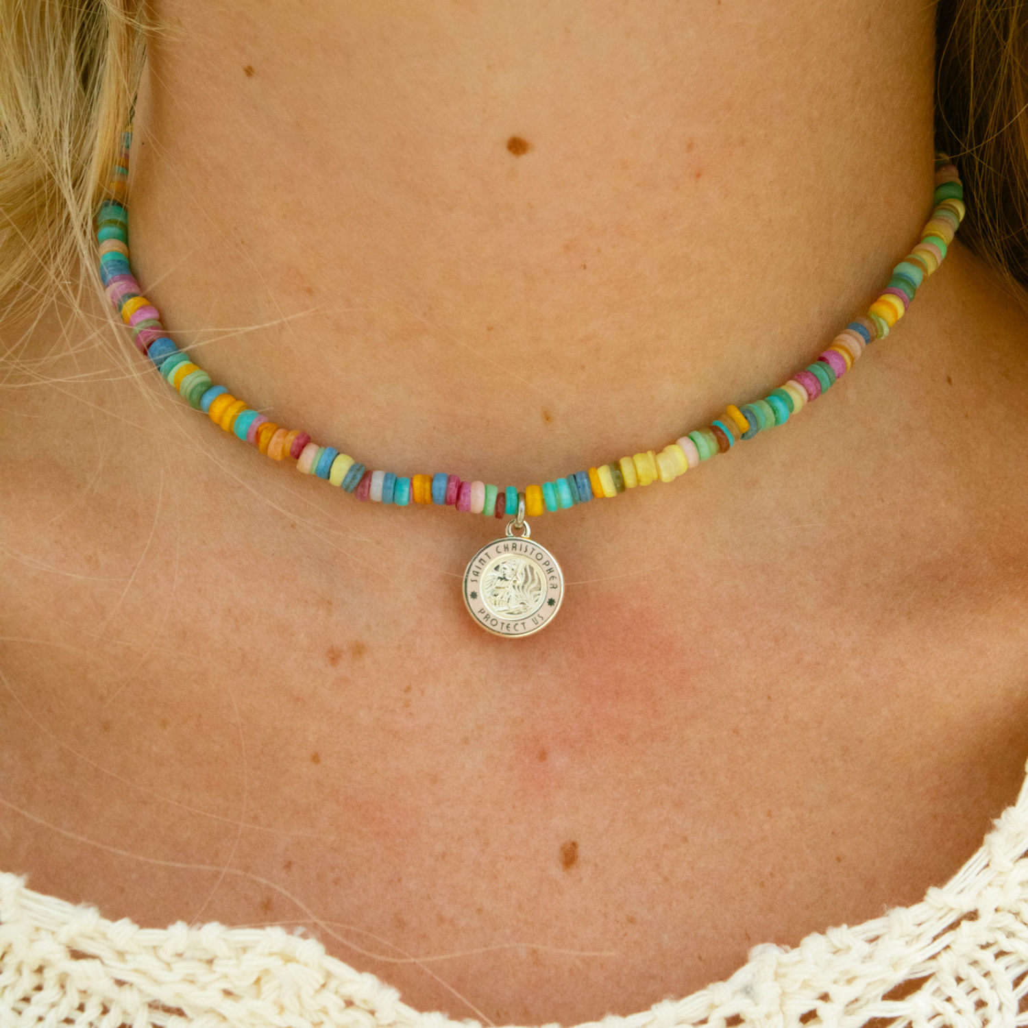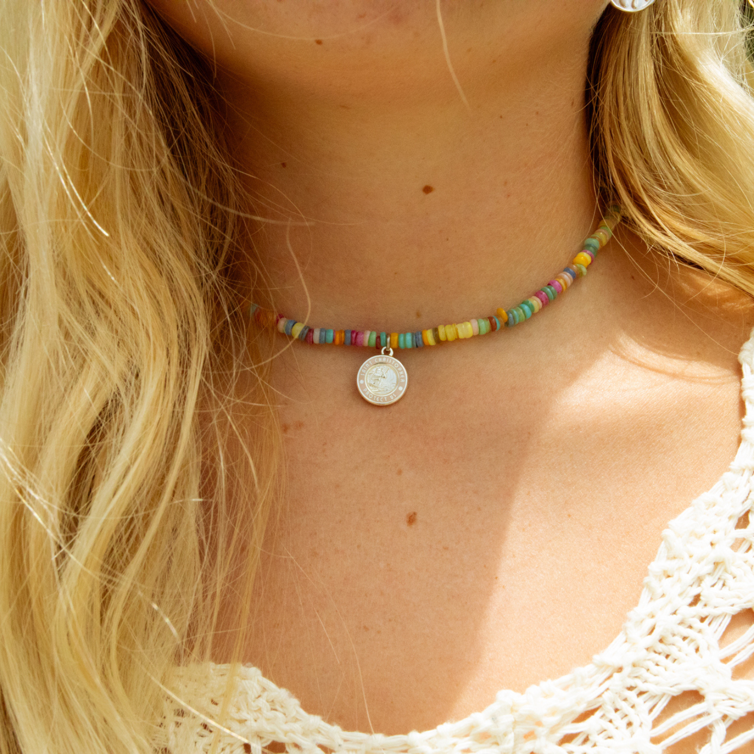 ¡Prepárate para vivir una experiencia de ensueño con nuestra gargantilla de cuentas Atardeceres Pastel! Esta encantadora gargantilla presenta una encantadora mezcla de cuentas heishi rondelle multicolores pastel, que capturan a la perfección los suaves tonos del cielo al atardecer. La delicada combinación de colores le da un toque caprichoso a cualquier atuendo, convirtiéndola en un accesorio dulce y elegante para cualquier ocasión. La gargantilla de cuentas Atardeceres Pastel es perfecta para usar a diario o para salidas especiales de verano, ya sea para un picnic o simplemente para darle un toque de magia pastel a tu día. Combínalo con nuestros otros accesorios divertidos para un look cautivador.