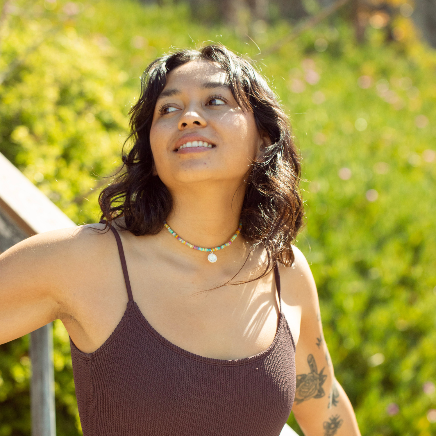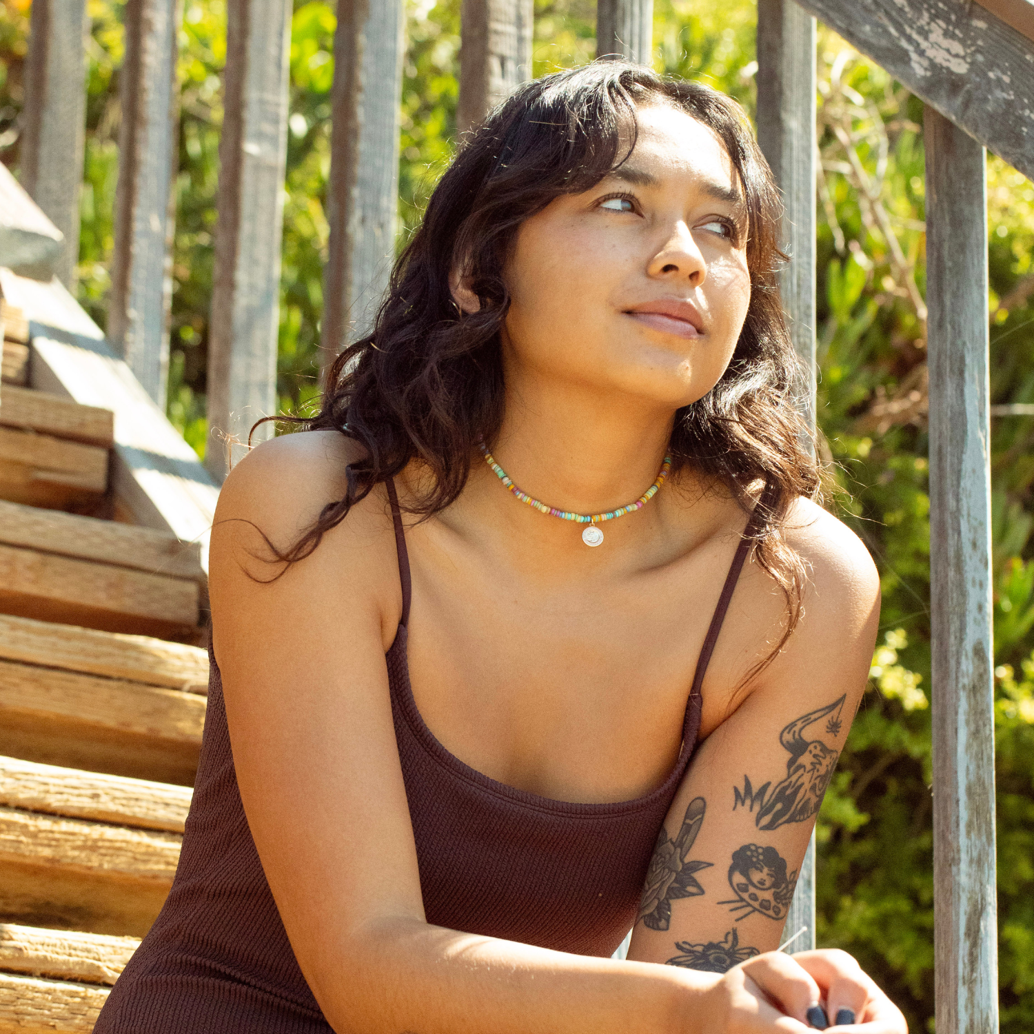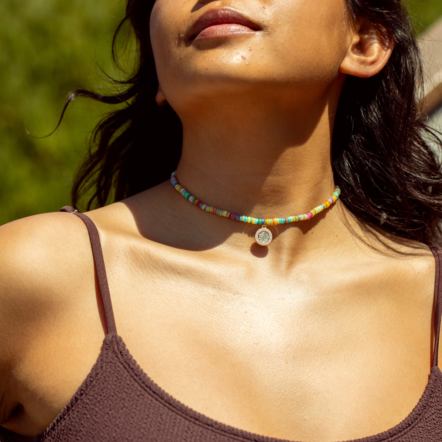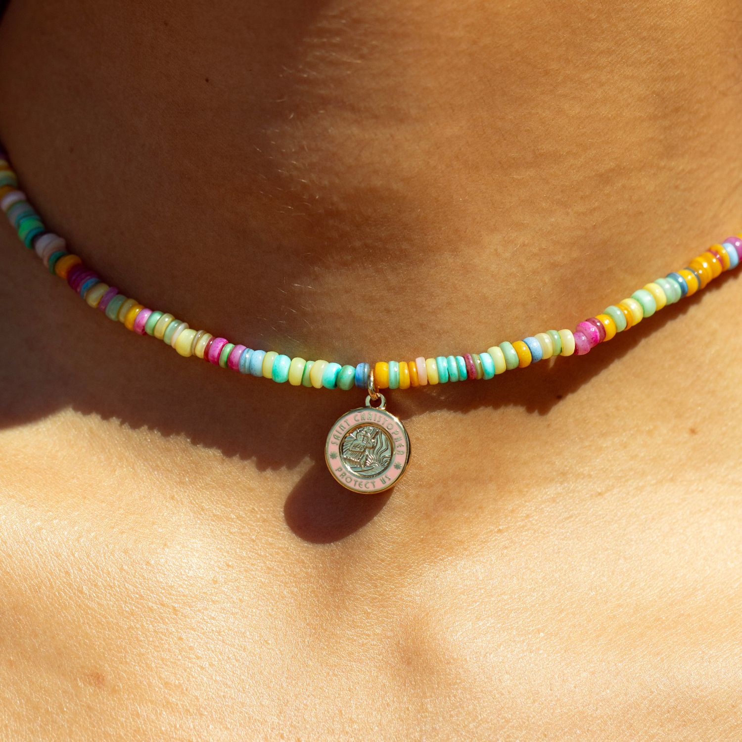 ¡La gargantilla de cuentas Atardeceres Pastel ahora en dorado! Esta gargantilla es una mezcla de ensueño de suaves tonos playeros. Con cuentas de colores y un pequeño colgante de San Cristóbal rosa dorado, es la combinación perfecta de buenas vibras y protección atemporal. ¡Llévala como un recordatorio diario de cielos dorados y aventuras infinitas!