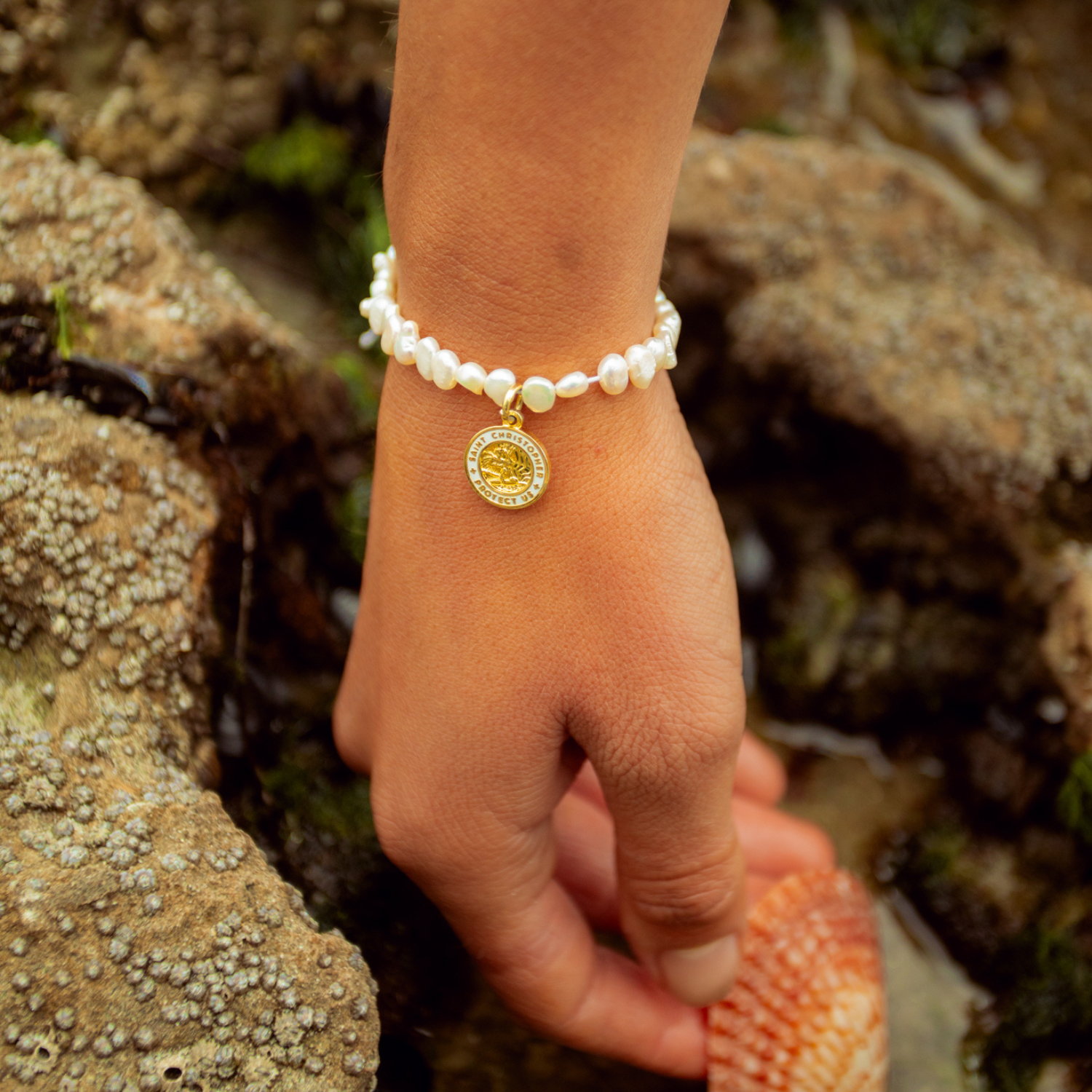 Presentamos la Pulsera de Perlas Shoreline, con un radiante colgante de San Cristóbal en oro blanco para protegerte en todas tus aventuras costeras. Adornada con perlas luminosas, esta pulsera ajustable es perfecta para añadir un toque de emoción oceánica a tu look.