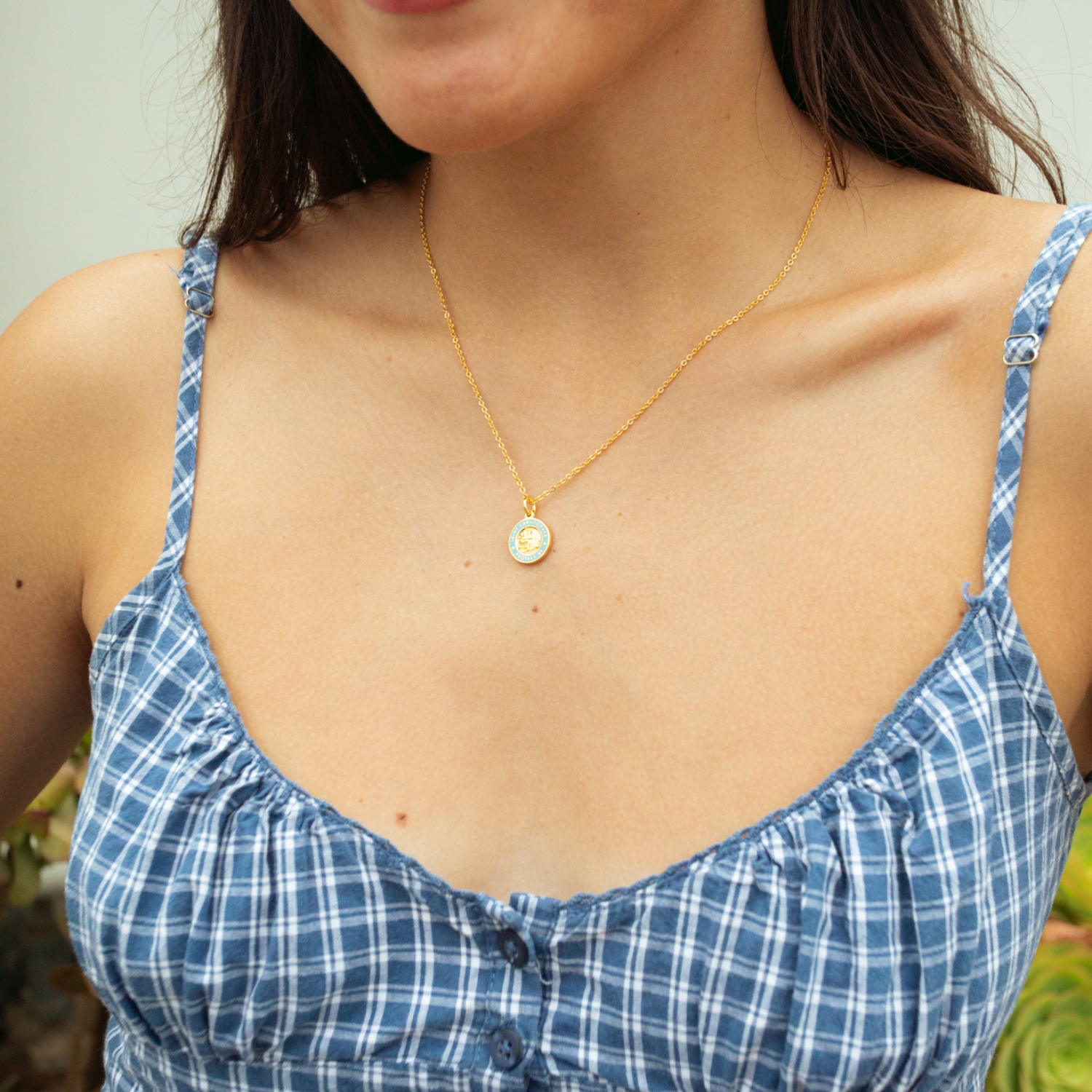 ¡Lo pediste, lo escuchamos! Presentamos nuestro nuevo collar dorado de San Cristóbal en azul celeste. Elaborado con un impresionante borde de esmalte azul celeste, este collar es la última incorporación a nuestra colección clásica. Ahora disponibles en aún más colores, nuestros collares dorados de San Cristóbal son perfectos para cualquier ocasión. ¡Cantidad limitada, así que consigue el tuyo mientras puedas!