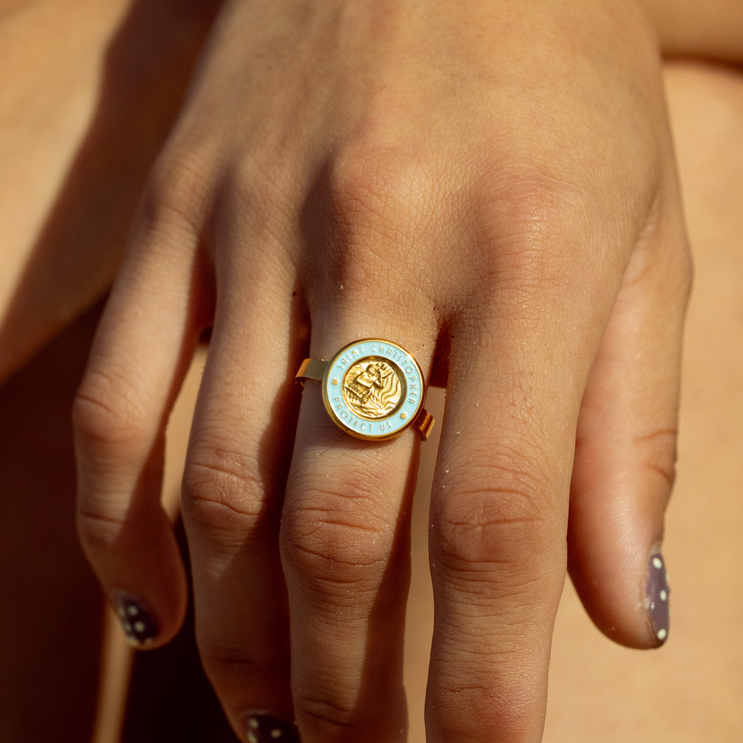 Presentamos nuestro nuevo Anillo Dorado Azul Bebé de San Cristóbal: ¡un favorito de los fans, ahora en formato anillo! Con su vibrante diseño en azul bebé y dorado, esta pieza es perfecta para amantes de la playa, surfistas y aventureros que buscan estilo y protección.
